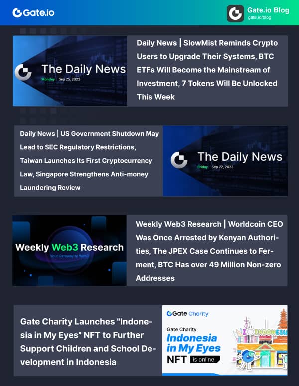From September 16 to September 30, we released a number of blog articles: Daily News | SlowMist Reminds Crypto Users to Upgrade Their Systems, BTC ETFs Will Become the Mainstream of Investment, 7 Tokens Will Be Unlocked This Week Daily News | US Government Shutdown May Lead to SEC Regulatory Restrictions, Taiwan Launches Its First Cryptocurrency Law, Singapore Strengthens Anti-money Laundering Review Weekly Web3 Research | Worldcoin CEO Was Once Arrested by Kenyan Authorities, The JPEX Case Continues to Ferment, BTC Has over 49 Million Non-zero Addresses Gate Charity Launches CFTC Goes After Three DeFi Protocols