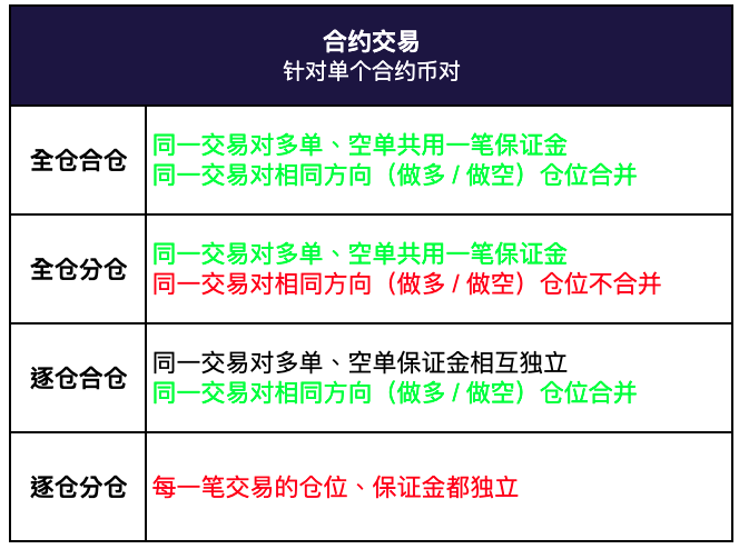 无论是全仓/逐仓,还是合仓/分仓,都只是针对单个合约币对账户(如 BTC/USDT 合约账户)的交易做的优化,旨在满足用户放大保证金使用效率、控制不同仓位风险等精细化、个性化资金管理需求。