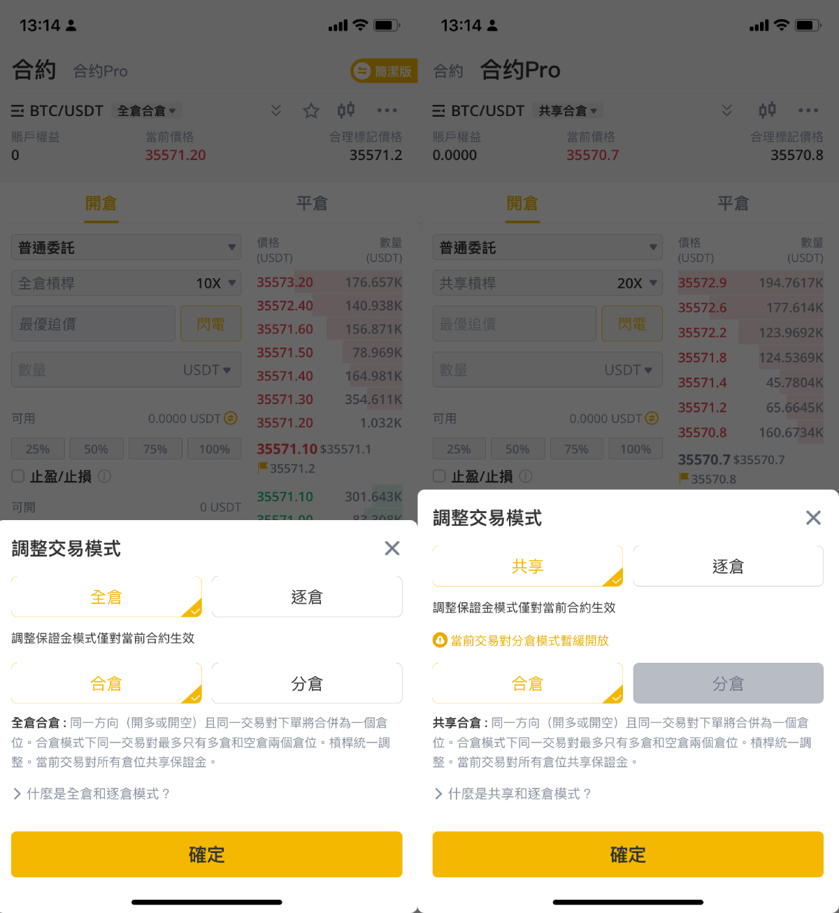合仓、分仓的区别在于,用户在同一交易对、同一方向上的多次开仓是否合并显示。
