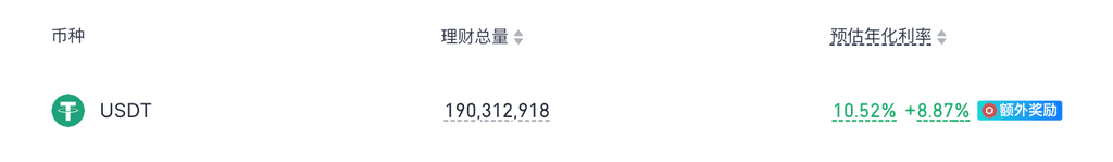 您在獎勵池有效期間成功借出了USDT,成功借出時,USDT借出年化為10.52%,額外獎勵池利率為8.87%,那麼該小時您可以享受10.52%的原借出收益,以及額外的8.87%收益對應的額外收益獎勵,最終總收益為19.39%。
