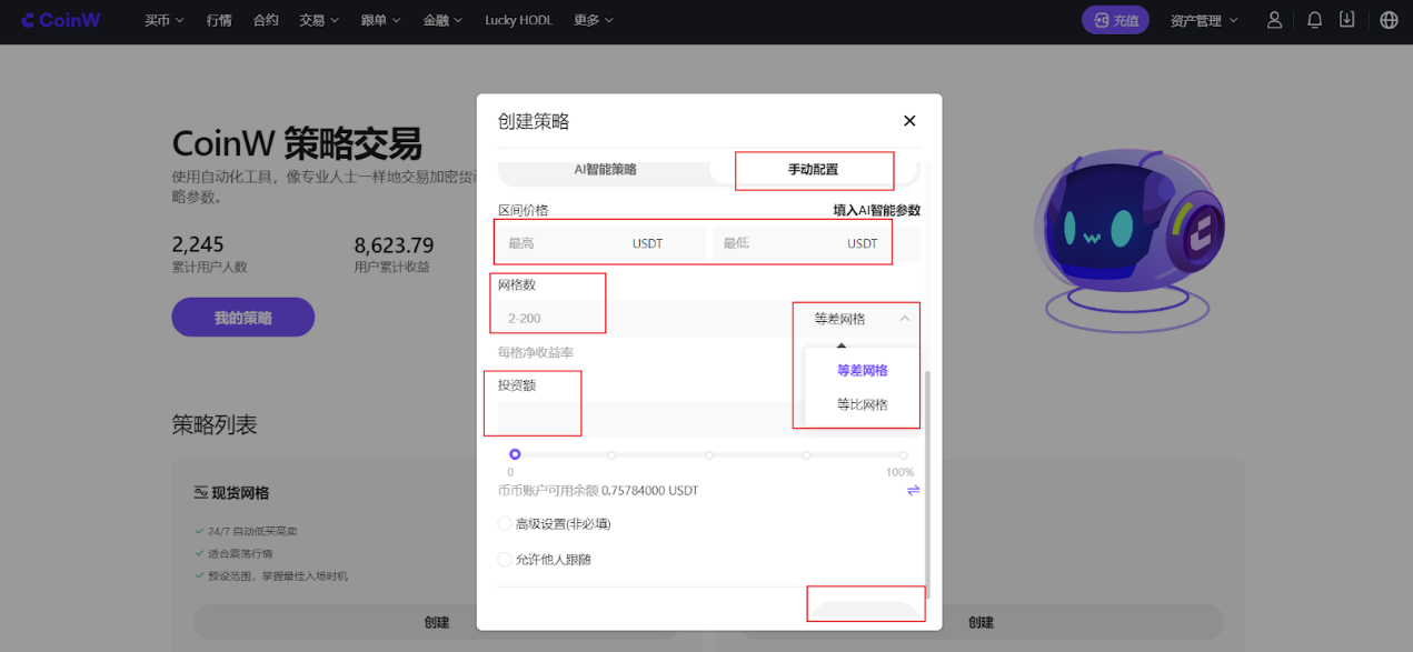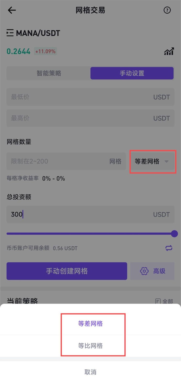 在网格交易页面,选择手动设置,分别输入区间价格、网格数、选择网格类型(等差网格/等比网格)、总投资额后即可创建网格。