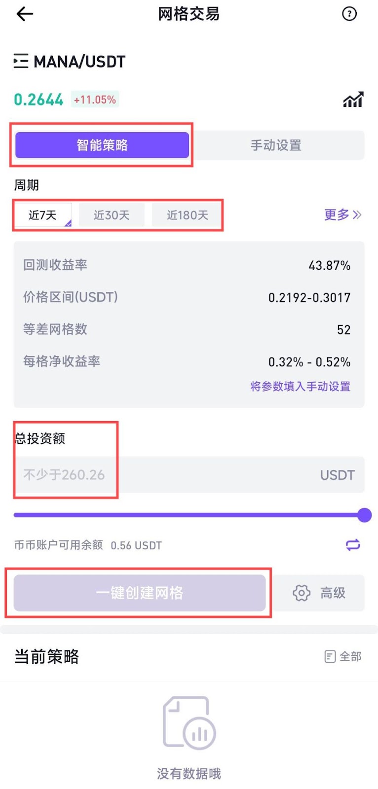 在网格交易页面,选择智能策略,选择网格周期类型后,输入总投资额,即可轻松创建网格策略。