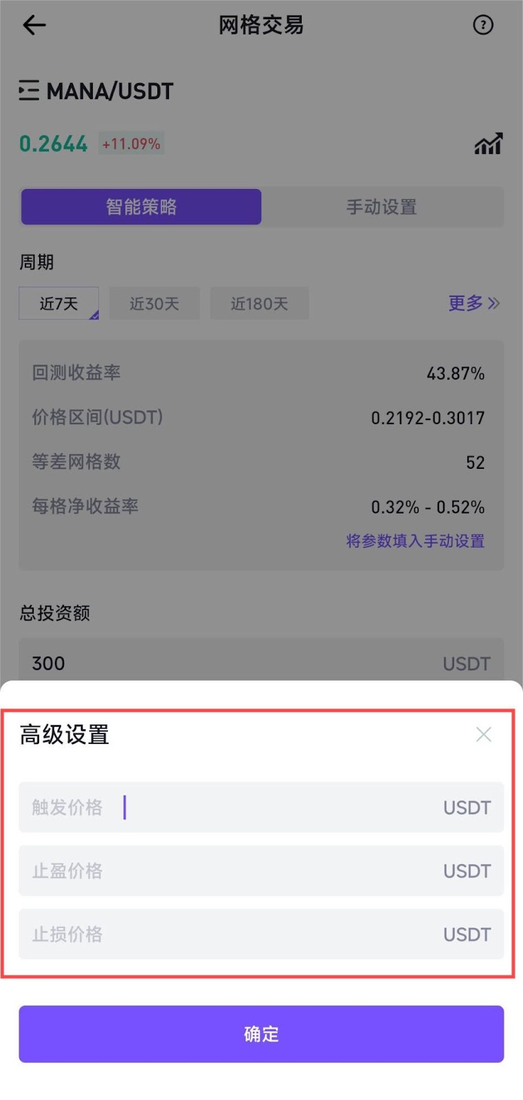 在AI智能策略中,也可选择“高级设置”对网格策略进行止盈止损,分别设置触发价格、止盈价格、止损价格。