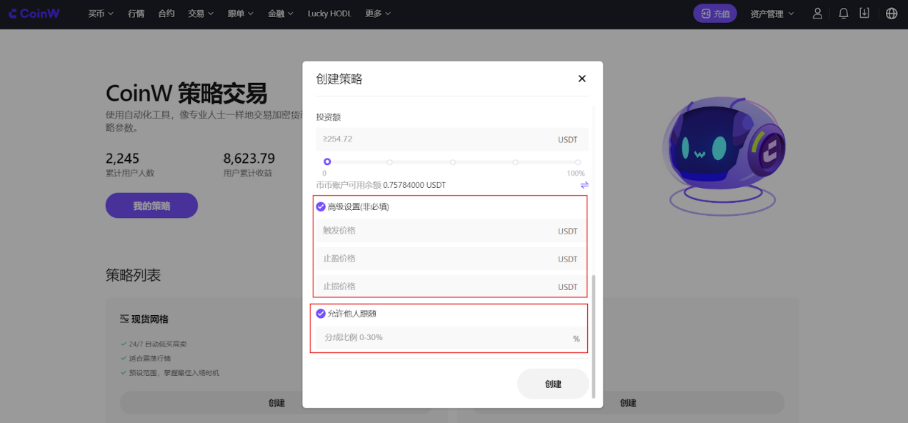在手动配置网格策略中,除了可选“高级设置”对网格策略进行止盈止损外,还可设置“允许他人跟随”并设置盈利分成比例。