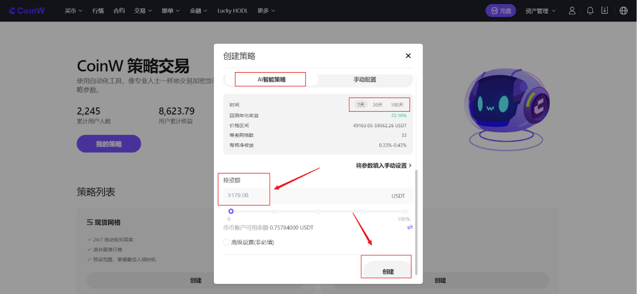 在网格交易页面,选择AI智能策略,选择网格时间类型后,输入投资额,即可轻松创建网格策略。