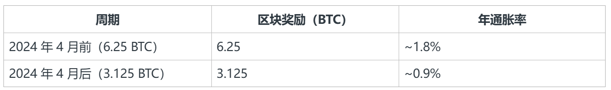 随着区块奖励递减,比特币年通胀率同步减半,往往推高 BTC 市场价格。