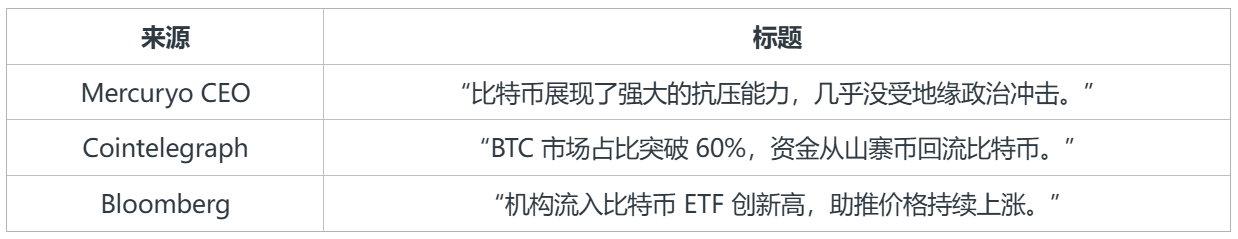 - BTC 占比超 60%:Cointelegraph 报道资金从山寨币回归比特币,意味市场偏好向 BTC 集中。