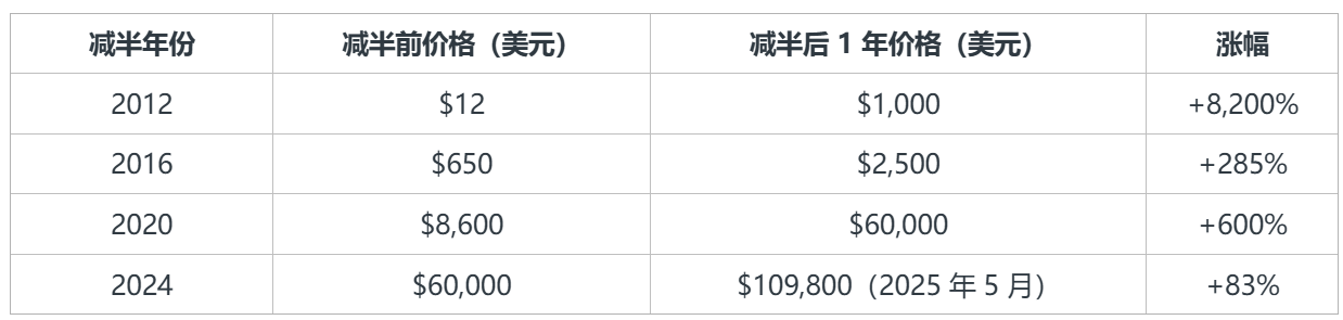 - 减半后一年价格(截至 2025 年 5 月)约 $109,800(≈ 83%)