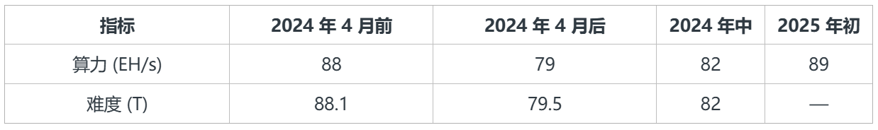 减半后,算力较低效的矿工一度关停矿机,导致 7 日移动平均算力从约 88 EH/s 降至 79 EH/s;网络难度也从 88.1 T 下降约 10% 至 79.5 T。此后难度和算力逐步回升,到 2024 年中旬算力回稳在 82 EH/s;至 2025 年初,7 日 SMA 算力又上升到约 89 EH/s,仅较减半前下滑 2%,说明大厂矿商持续支撑网络安全。