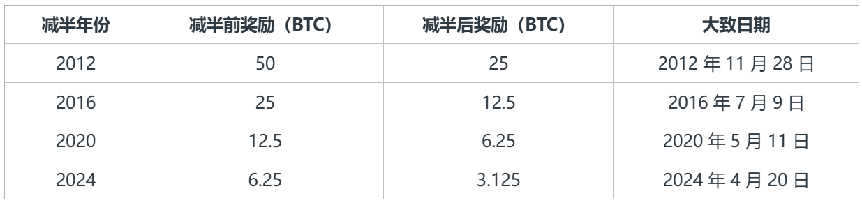 - 区块奖励从 6.25 BTC 降至 3.125 BTC