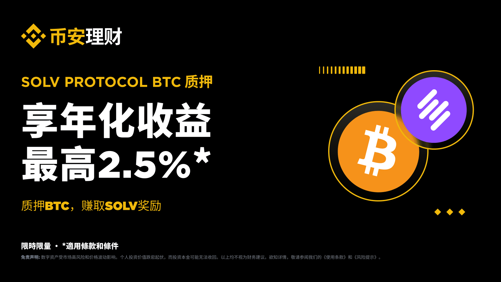 币安链上赚币将推出Solv Protocol(SOLV)BTC质押专属活动!活动期间质押BTC享最高2.5%* 年化收益率的SOLV奖励!
