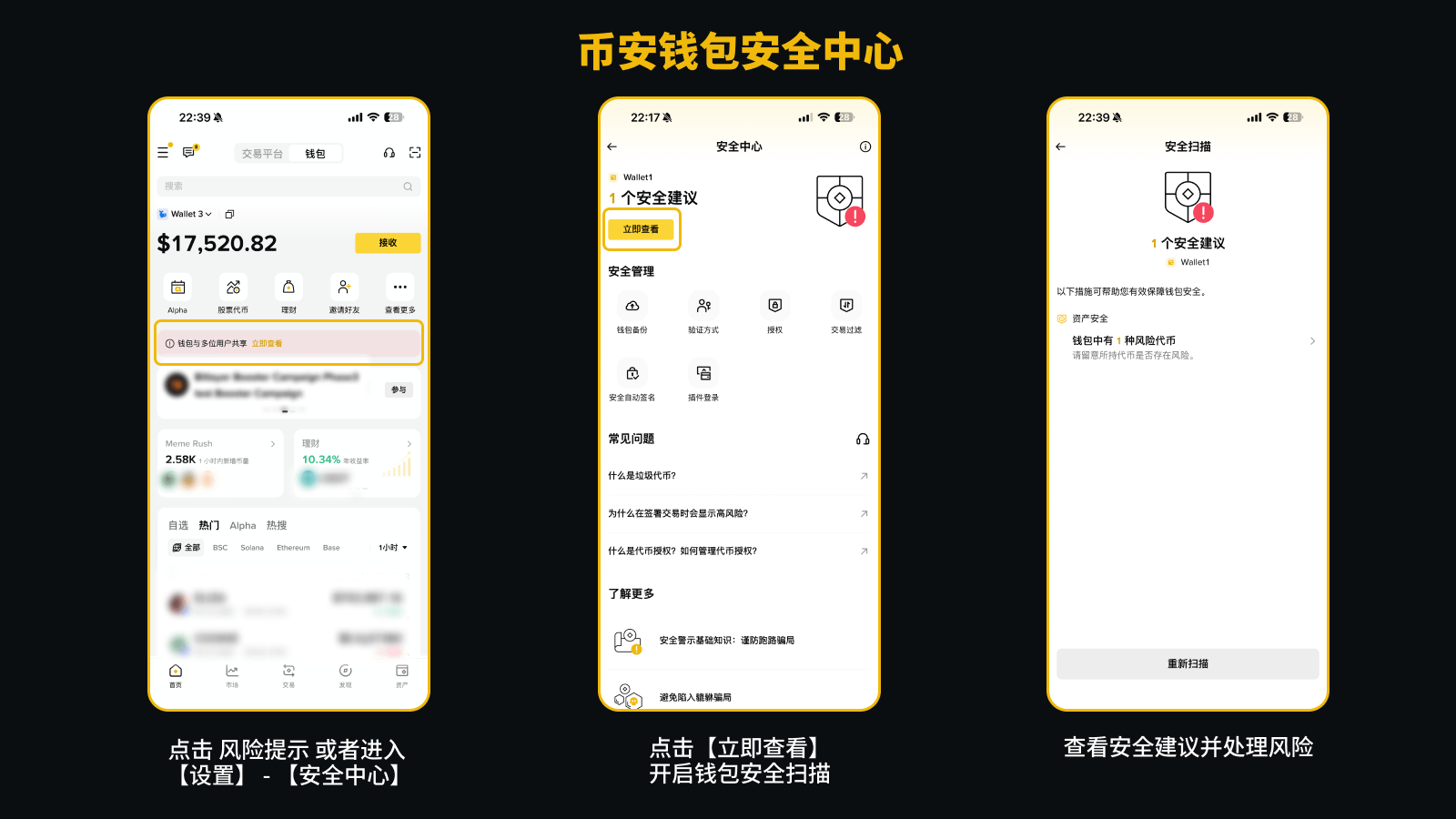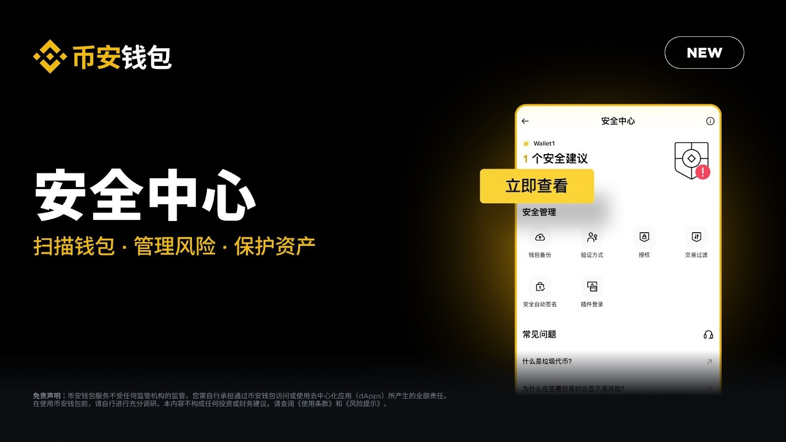 为进一步提升用户资产安全体验,币安钱包正式推出【安全中心】 —— 一个集安全管理、风险监控与防护于一体的全新平台。通过安全中心,用户可以全面掌握钱包风险状况,及时识别潜在隐患,从而更高效地保障资产安全。