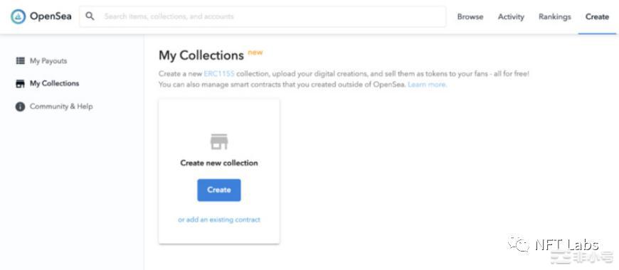 OpenSea 平台也支持 NFT 创建,而且完全免费,用户不需支付手续费来部署智能合约。点击网站右上角的“Create”就可以开始创造了。