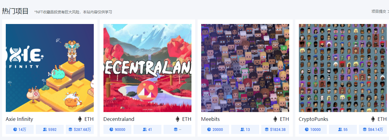 除了热门艺术家,热门项目也是帮助大家发掘值得关注和研究的NFT的,大家可以通过给出的项目共发行NFT个数、参与用户数和成交总额来判断。