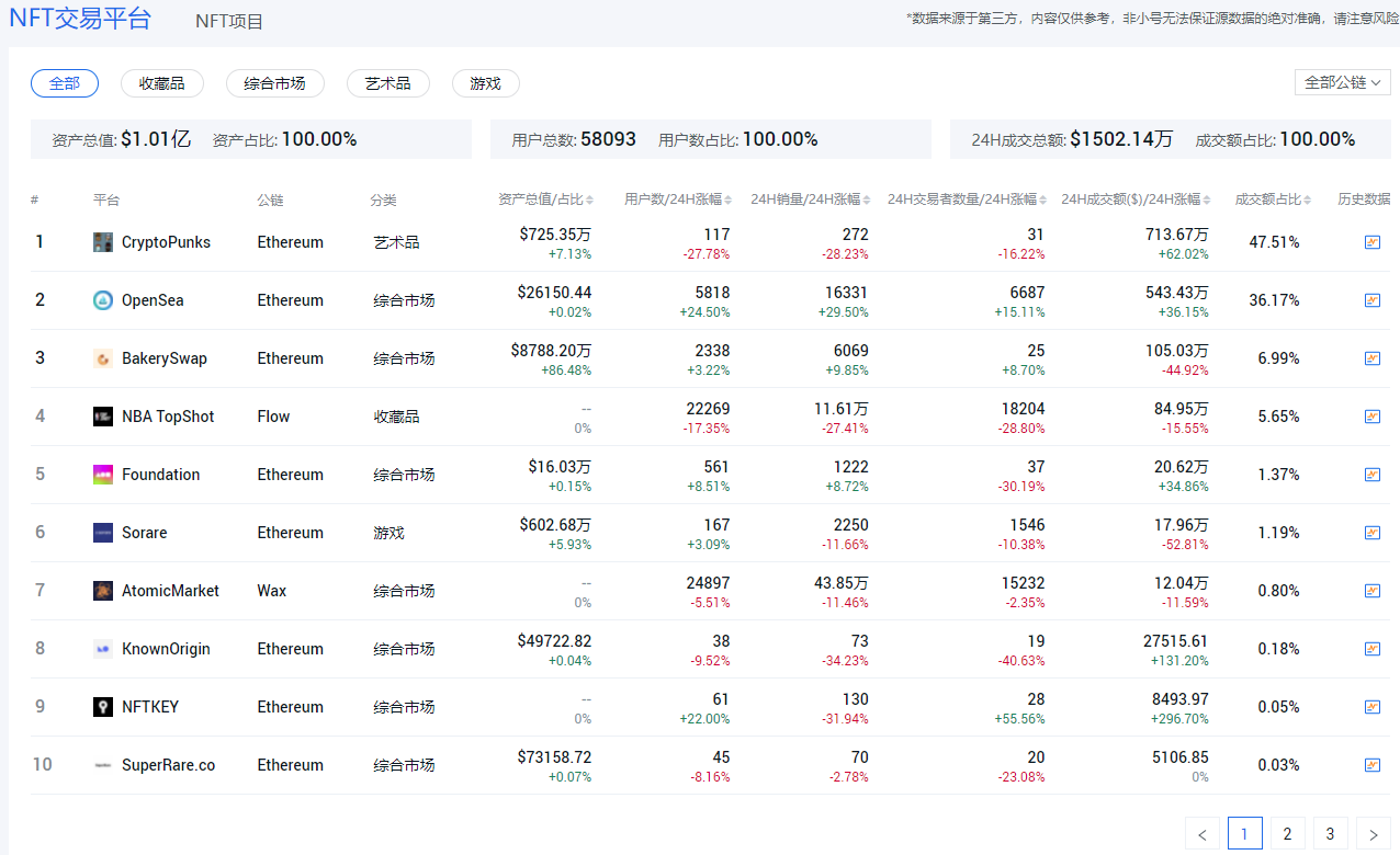 NFT交易平台的数据非常多,但理解起来并不难。它和现货的交易所非常像,这个板块的数据主要是帮大家去了解目前NFT市场主流交易平台有什么类型,平台上总资产的数额和涨跌变化。