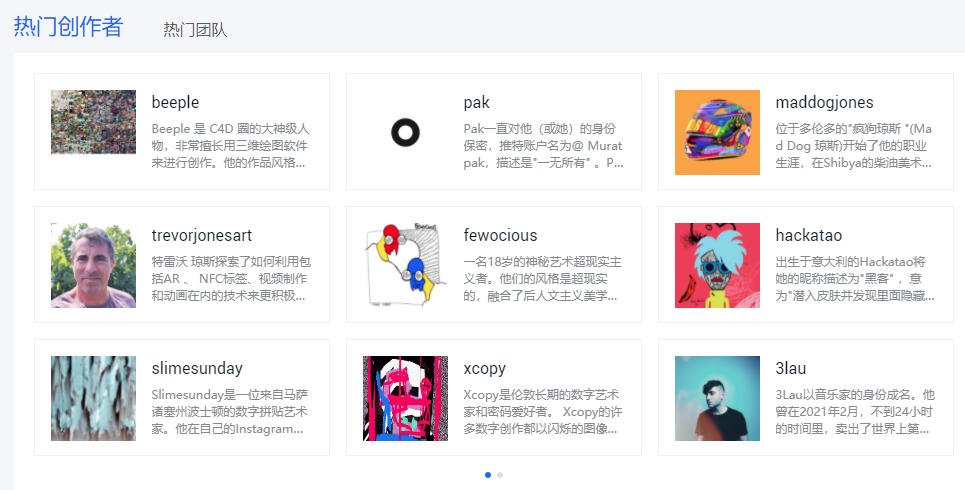 由于这些艺术家相对此前币圈的KOL来说比较小众,所以我们将当前热门的NFT创作者进行了收集和整理,大家只需要通过这个板块就能了解到,全球NFT热门创作者的个人介绍以及最富盛名的作品。
