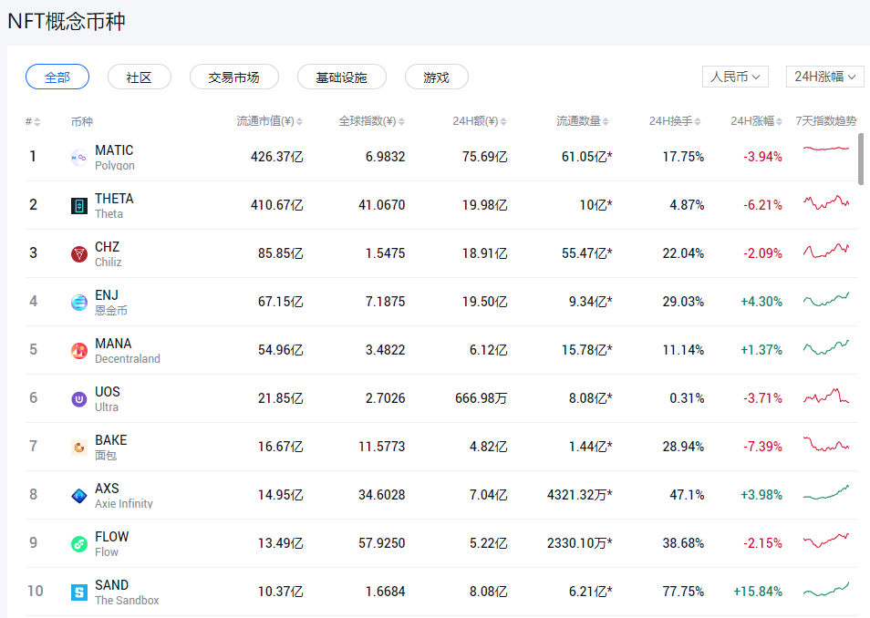 最后一个数据板块是NFT概念的币种,相信不少非小号粉丝曾经投资过这些币种。这些币不是NFT,但它们是NFT项目的平台币或者治理币等,或者这个项目原本是公链或者DEX,但目前已经孵化出了自己的NFT项目。