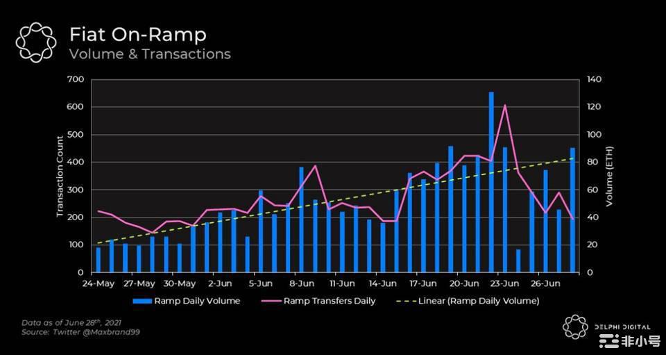因为法币入金目前仅支持购买 ETH,不支持出售加密资产,因此数据仅显示了法币入场(on-ramp)的购买活动。6 月 22 日,法币 on-ramp 日交易额创下历史新高约 130 ETH,考虑到 1 个月前还不到 20 ETH,这意味着取得了非常强劲的增长。由于 ETH 在 Ronin 上的唯一用途是从市场上购买,因此预计会提升市场交易额,尽管只是少量提升。