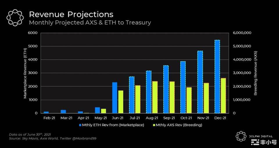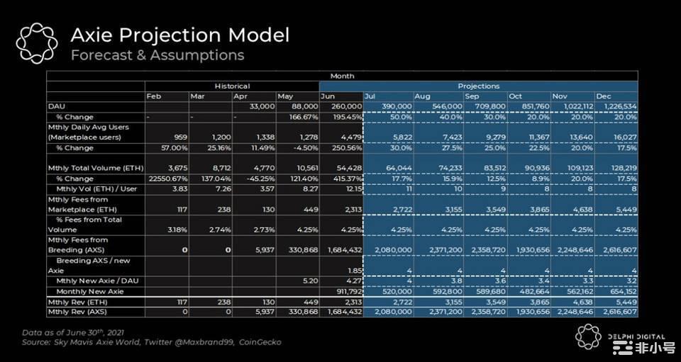 我们推断当前趋势预测了 Axie 平台至 2021 年底的增长趋势。该平台目前的 DAU 每周增长约 30%。5 月和 6 月的 DAU 分别增加了约 5.5 万和 17.2 万,增长率分别为 167% 和 197%。