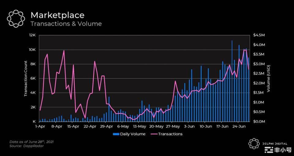 市场日成交数量伴随金额一起增长,日交易额已从 4 月底时的每天约 10 万美元,6 月时一度猛增至逾 400 万美元。用户数量增长,正向推动了市场成交量的增加,因为玩家想要玩游戏的门槛,是至少购买 3 个 Axies 才能参与战斗。