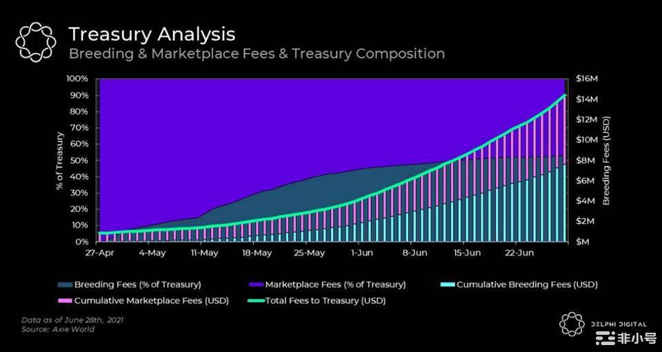 在 Ronin 推出之前,市场费用是金库收入的绝对大头。 然而,自从两个月前推出 Ronin 以来,繁殖费用已经增长到占金库总收入的 50% 以上。在 Ronin 推出之前,宠物主人以 ETH 支付 SLP 和交易费用,gas 费通常对于许多用户来说过高了,这不仅不利于宠物主人,金库也无法收到任何繁殖费。