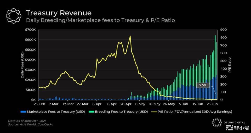 - 通过繁殖(breeding)和市场费用,Axie 的社区金库在大约两个月内从不到 100 万美元增长到超过 1400 万美元,这意味着 AXS 的市盈率(完全稀释估值 /30 天年化收益)目前为 7.59。