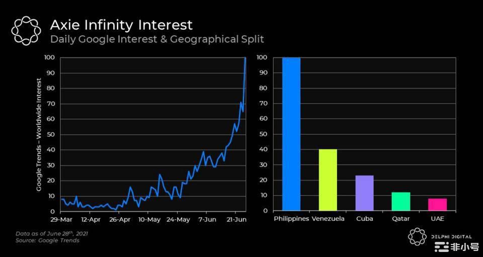 去年,一位委内瑞拉玩家发表了一篇文章,称她玩 Axie 几天比工作一个月挣得还多。我们使用谷歌搜索趋势来评估「Axie Infinity」的搜索热度,100 代表该词的热度上限,50 意味着达到人气热度上限的一半。可以看到,过去三个月对 Axie 的 Google 搜索兴趣大幅增。