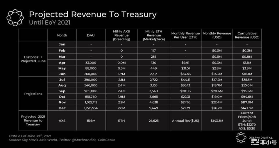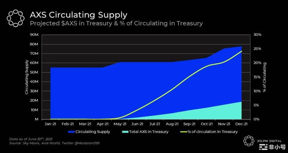 表面上看,你可能认为 Axies 的供应量目前符合用户需求,因为每个用户需要 3 个 Axies 才能玩,但是高级用户和各种收藏家拥有许多 Axies。这就是为什么我们认为该比率( Axies 月繁殖数 / 每月新增 DAU)很有可能保持在 3 以上,但在未来几个月逐渐下降。将这一比率与 DAU 数值结合起来计算,我们就能够计算出有多少 AXS 将累积到金库中。