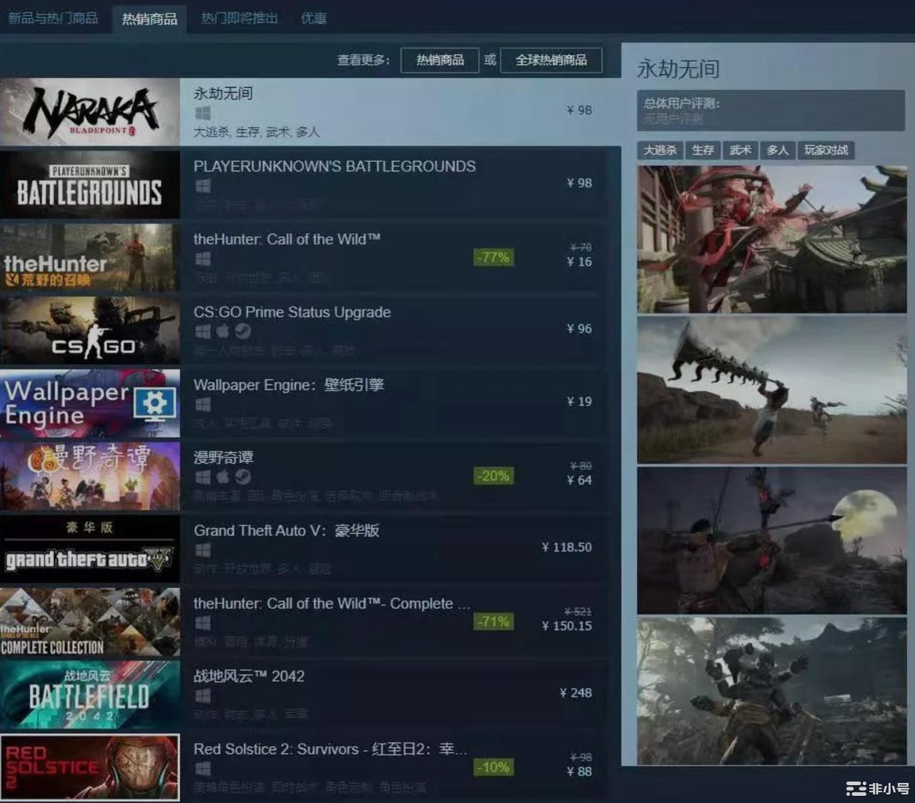 其实永劫无间的受欢迎程度,此前早有展现:Demo测试期间,游戏的Steam同时在线人数峰值突破18W,在实时人数榜上挤下《GTA5》《彩虹六号:围攻》等老牌游戏;预售阶段又登顶Steam热销榜,位列销量周榜第四。