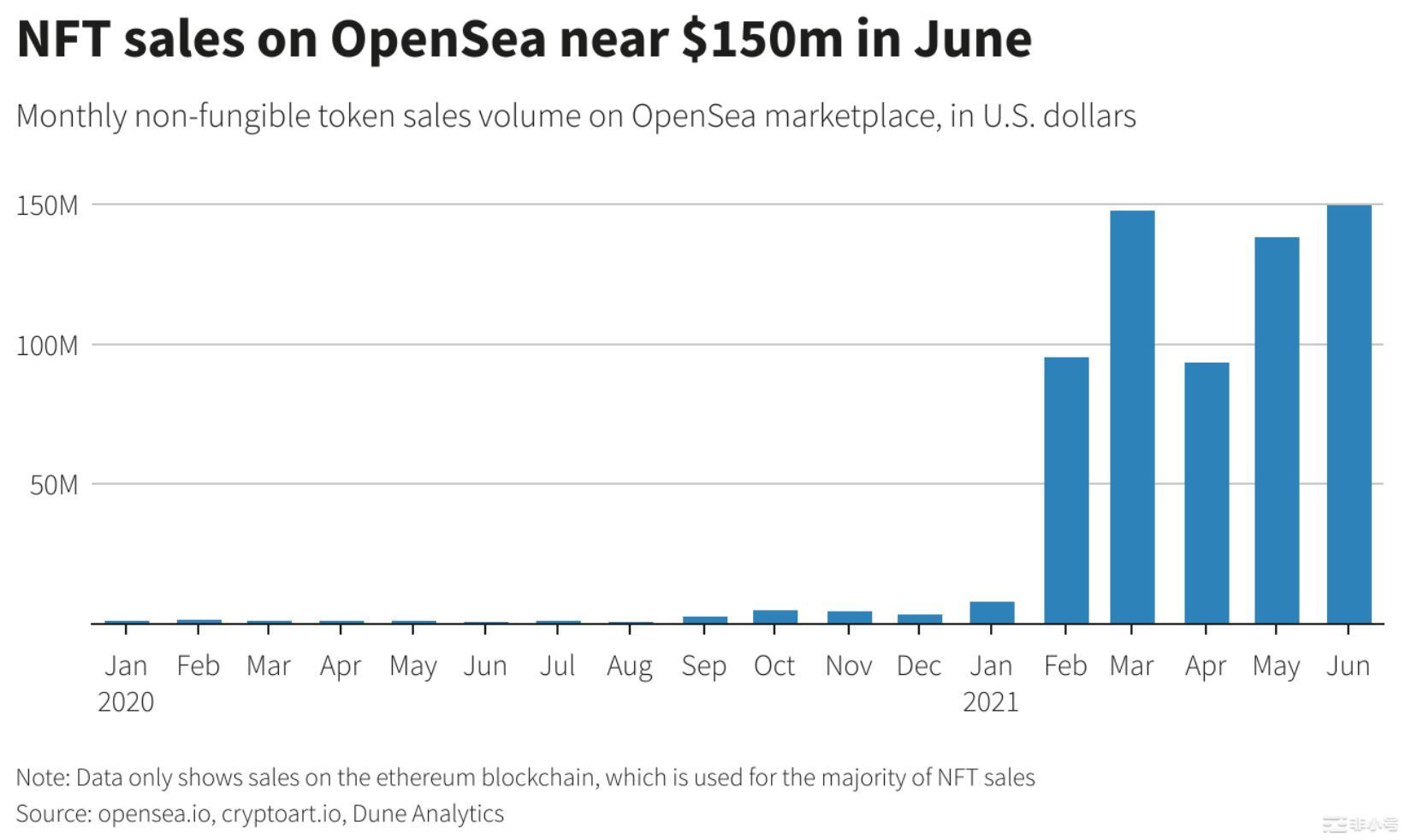 6月,知名的NFT交易平台 OpenSea 更是创下了1.5亿美元交易额的历史新高。近4万名活跃的交易者提供了超过211,000笔的NFT销售。