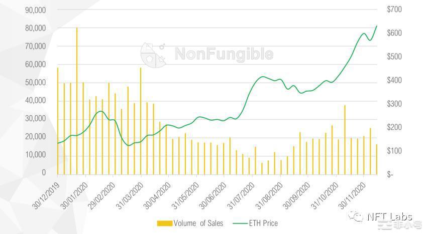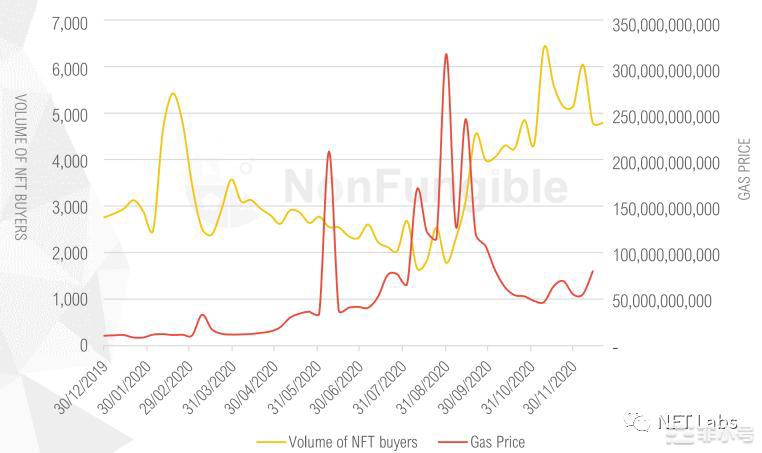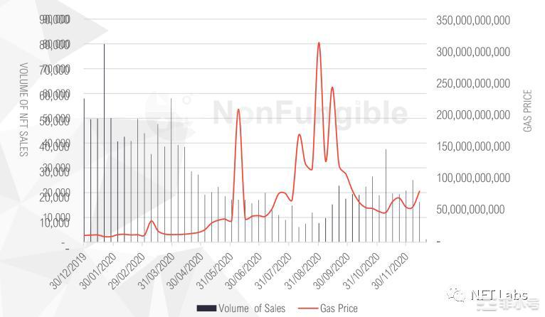 2020 年整个7月和8月,GWEI 的价格急剧上涨减少了每周 NFT 的交易量。从 9 月中旬开始,当 Gas 成本开始下降到用户可以承受的价格时,销售量自动增加。