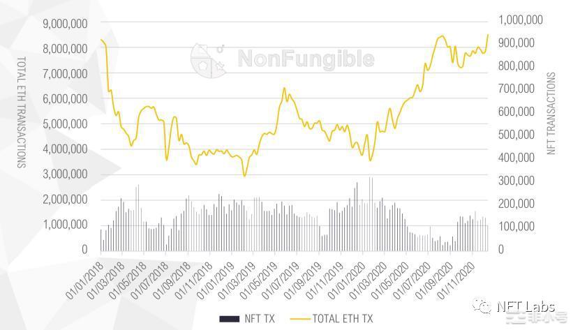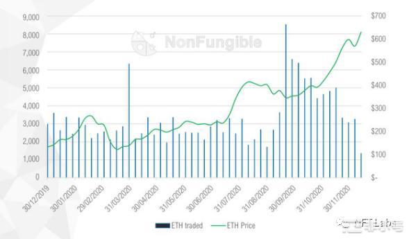 2020 年 NFT 交易额 vs 以太坊区块链总交易额