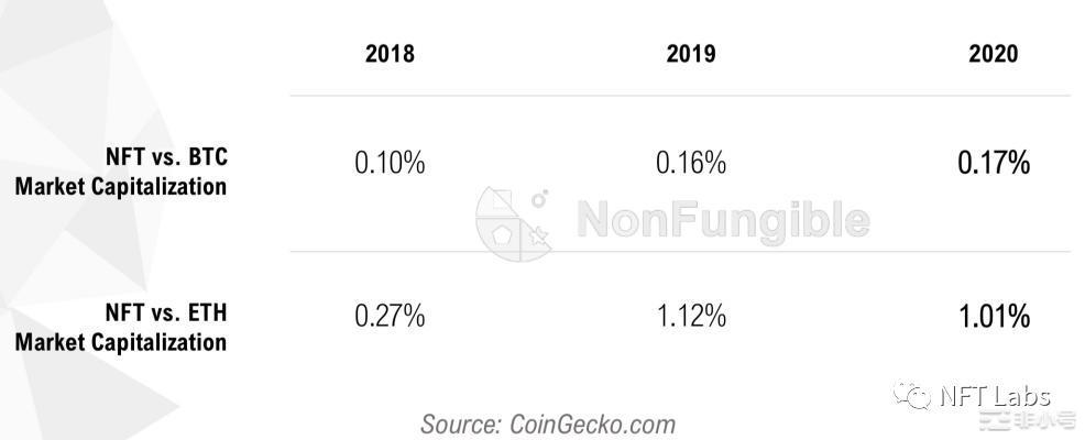由此可见,2019 年,NFT 在加密寒冬期间取得了坚实增长:NFT 在整个以太坊市值中占比 1% 以上,对比特币市值也有一定收益。