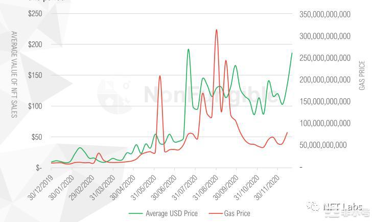 2020 年 NFT 销售均值与以太坊 Gas 费用的对比