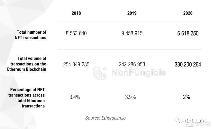 此外,也可以注意到,与以太坊区块链上的总交易额相比,每周平均 NFT 交易额极低;以太坊区块链上每周交易额超 500 万,而 NFT 交易额为 12 万。