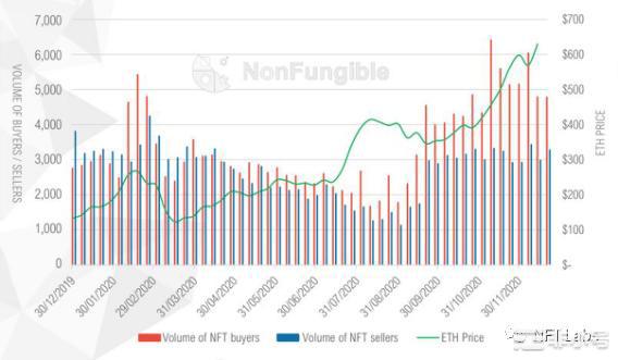 2020 年最后一个季度,随着以太币价值的恢复和网络成本的同步下降,NFT 买家/卖家数量显著增加。很难将此激增单独归因于这两个因素中的某一个因素。