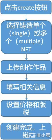 Rarible是一个基于以太坊的NFT铸造和交易平台,主要涉及艺术类NFT的铸造流通。Rarible的独特优势在于它提供有版税设置功能,即NFT版权的所有者可以在铸造NFT时设置版税比例。这样,每次NFT作品进行流通交易,版权所有者都可以按比例获得版税收益。进行铸造的流程图如下: