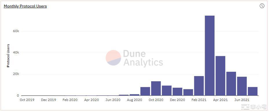 市场数据方面,Rarible的交易额同样是在今年2月暴涨,于3月达到顶峰的3940万美元,用户数量和铸造的NFT数量也于同期达到历史最高的75000人和84000枚。之后伴随市场降温,Rarible没能像Opensea一样上扬,而是逐渐走低。目前,Rarible和Opensea的体量差距还是非常明显的,近三十天内的交易额约为后者的二十分之一。