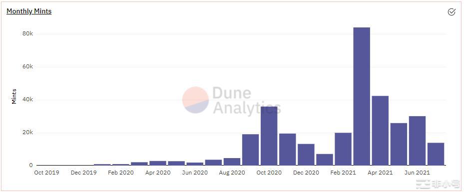 Rarible月度铸造NFT量(2019.10-2021.7)