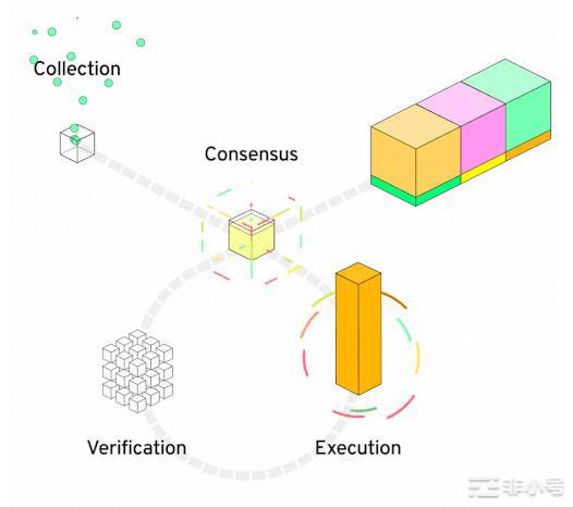 Flow是2017年火遍网络的加密猫(CryptoKitties)开发团队Dapper Labs新开发的NFT公链项目。Flow官方如此定义他们的公链:“为下一代应用程序、游戏以及数字资产而构建的区块链。”传统区块链中,节点的功能往往非常完整,一个节点同时存储智能合约、账户余额等信息,并需要进行交易验证等工作,这也导致采用这种设计的以太坊性能受到很大限制。而Flow则采用独特的多节点体系架构,用户被分为收集(Collection)、共识(Consensus)、执行(Execution)以及验证(Verification)四个角色,在同一笔交易的不同阶段进行验证工作。这样的流水线设计极大提高了效率,保证可扩展性的同时避免了分片带来的复杂问题。角色分工具体如下图。
