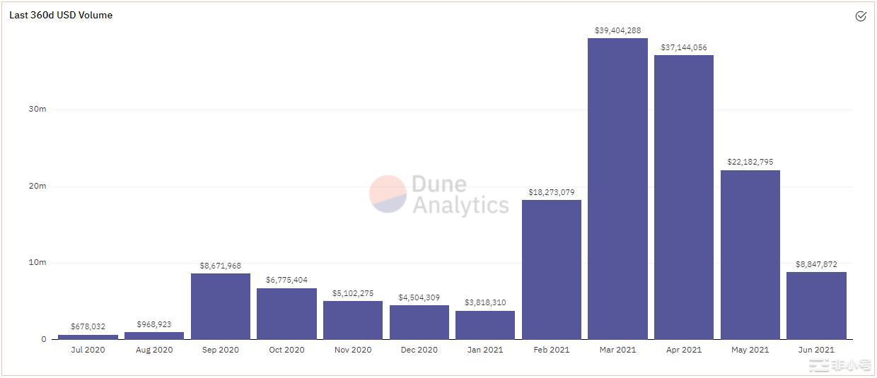 Opensea是全球最大的综合性NFT交易平台,涉及的NFT包括艺术、音乐、域名、体育等。同时,Opensea还提供有免gas手续费铸造、出售NFT的服务,这一点在市场鹤立鸡群。根据DuneAnalytics上的数据,2021年2月之前,Opensea上的NFT交易一直不温不火。来到二月份,NFT市场整体交易量呈现爆炸式增长,Opensea也不例外。整个二月份,Opensea的总交易额相比一月增长了十倍以上,达到了9500万美元以上,总交易NFT数增长了四倍,达到4万余件,活跃用户增长了一倍,为15000余人。随后,伴随着NFT市场的火爆,Opensea的热度也始终保持在较高水平,于5月4日达到了单日交易额2300万美元的最高纪录。