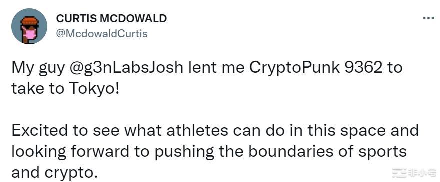 就在7月,美国奥运代表团的击剑运动员Curtis McDowald将自己的推特头像换成了第9362号加密朋克,并在推特上宣称:要将加密朋克带到东京,把体育和数字货币的边界都推向新的维度。