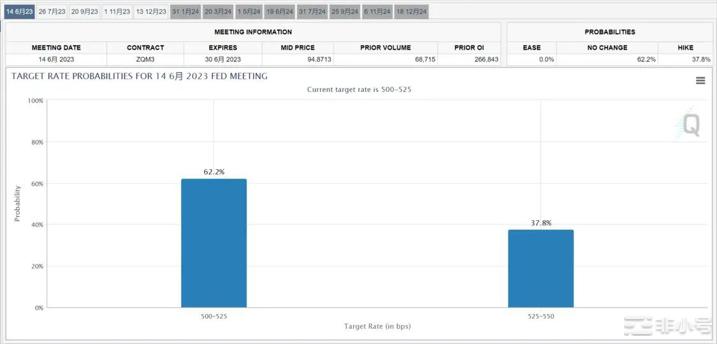 所以说,BTC的表现跟上面的其他指数相比并不弱,以上几个指数疲弱的原因大致有3个: --季节性因素,Sell in May和五穷六绝是黄金经验总结 --全球经济衰退担忧,中国经济数据不及预期和欧美需求疲弱 --闹腾到现在还没结束的美债上限问题 此外,BTC弱和纳斯达克强还有一个共同的特殊原因:即AI革命,A16Z、Paradigm为首的机构们“喜新厌旧”,纷纷拥抱AI,Web3在硅谷如同明日黄花很难再骗到VC的钱 还有一点ChatGPT的大规模采用,让市场更加怀疑区块链和Web3是伪概念,是叙事泡沫 VC不爱、监管不喜、韭菜不玩,这段时间BTC表现弱很正常 以上种种,貌似只有美债上限问题可以在6月化解,其余因素将长期对加密市场构成负面影响,破解之外无外乎大家已经说烂的两点: --黑天鹅发生,美联储再来一轮史诗级放水 --诞生拥有亿级用户的Web3的杀手级应用 但目前来看,这两点在6月发生的可能性机会为0 因此6月大概率还是一个弱势行情 说下美联储加息: 昨天,美联储喉舌又公开放话,即便6月不加息,夏天还得继续加。并且CME预计美联储在6月会议上按兵不动的可能性为62.2%,加息25个基点的可能性为37.8%。怎么解读?就是美国疯了,彻底疯了,美国这样加息下去,权益市场一定崩,这么说吧,6月美联储不管加息与否,只要他接下来不是明确表示要降息,那么市场一定继续阴跌甚至大跌一波,我只做提前预测,欢迎后期打我脸。所以对于我们的投资建议:近期炒币的风险极高,尽量规避。 接下来的一些催化剂: 1.op的升级将于6月6日进行,大幅降低交易费用 2.Velo:op上最大的DEX,将在6月15日推出协议的第二次迭代 3.SpartaDex是Arbitrum上第一个游戏化的DEX,将在未来几周内推出 4.Cosmos:最大的2023年会议将于6月3日至5日举行。期待Cosmos项目的重大公告 5.Lybra Finance:LSD支持的收益率轴承稳定币背后的协议,将在6月推出Lybra V2 testnet