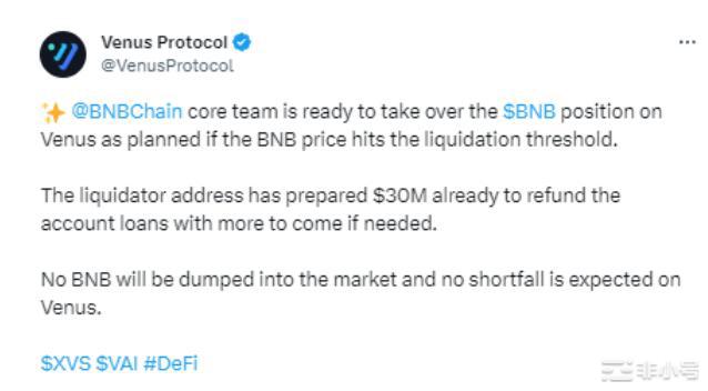 Venus在推特原本写道:“币安链核心团队已经准备好,如果BNB价格达到清算门槛,将按计划接管Venus上的BNB头寸。清算人地址已经准备3000万美元以退还账户贷款,如果需要的话,还会有更多。没有BNB会被抛售到市场上,预计在Venus上不会出现亏损。”