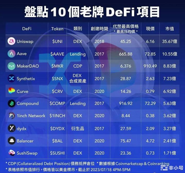 连日暴涨的老牌DeFi 项目!有哪些新叙事值得关注?此图为文内筛选出的10 个老牌DeFi 项目,手榴弹整理成图表。不论新老韭菜都可以接着阅读接下来的介绍。图表可看见其中有5 个是2017,1个2018、4 个2020 创立,运营至今都是至少超过3 年的老牌DeFi。
