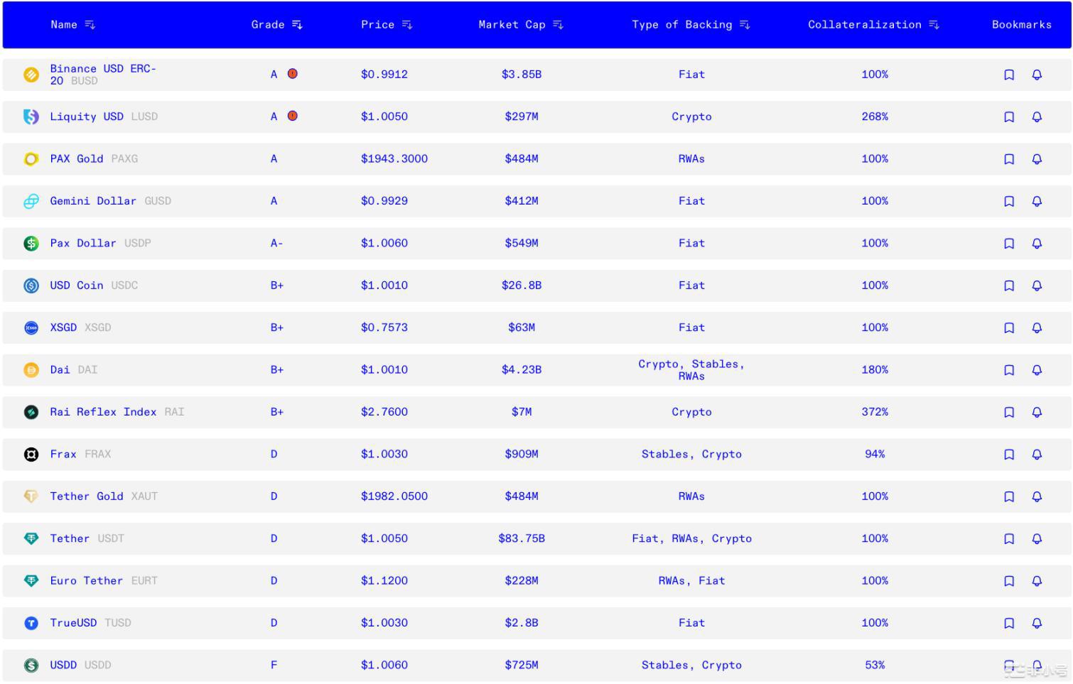 有趣的是,其他 DeFi 稳定币也在评估范围内,DAI 和 RAI 获得 B ,USDD 则被评为 F。