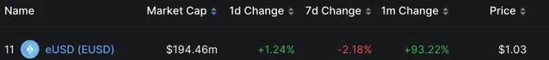 排在前 10 名之后的是 eUSD,这是 Lybra Finance 推出的一种稳定币。