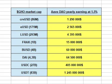 GHO 为 Aave DAO 带来了新的收入来源。当前借款利率设定为 1.5% ,如果到达与 LUSD 相当的市值,GHO 可能会为 Aave DAO 带来 440 万美元的收入。