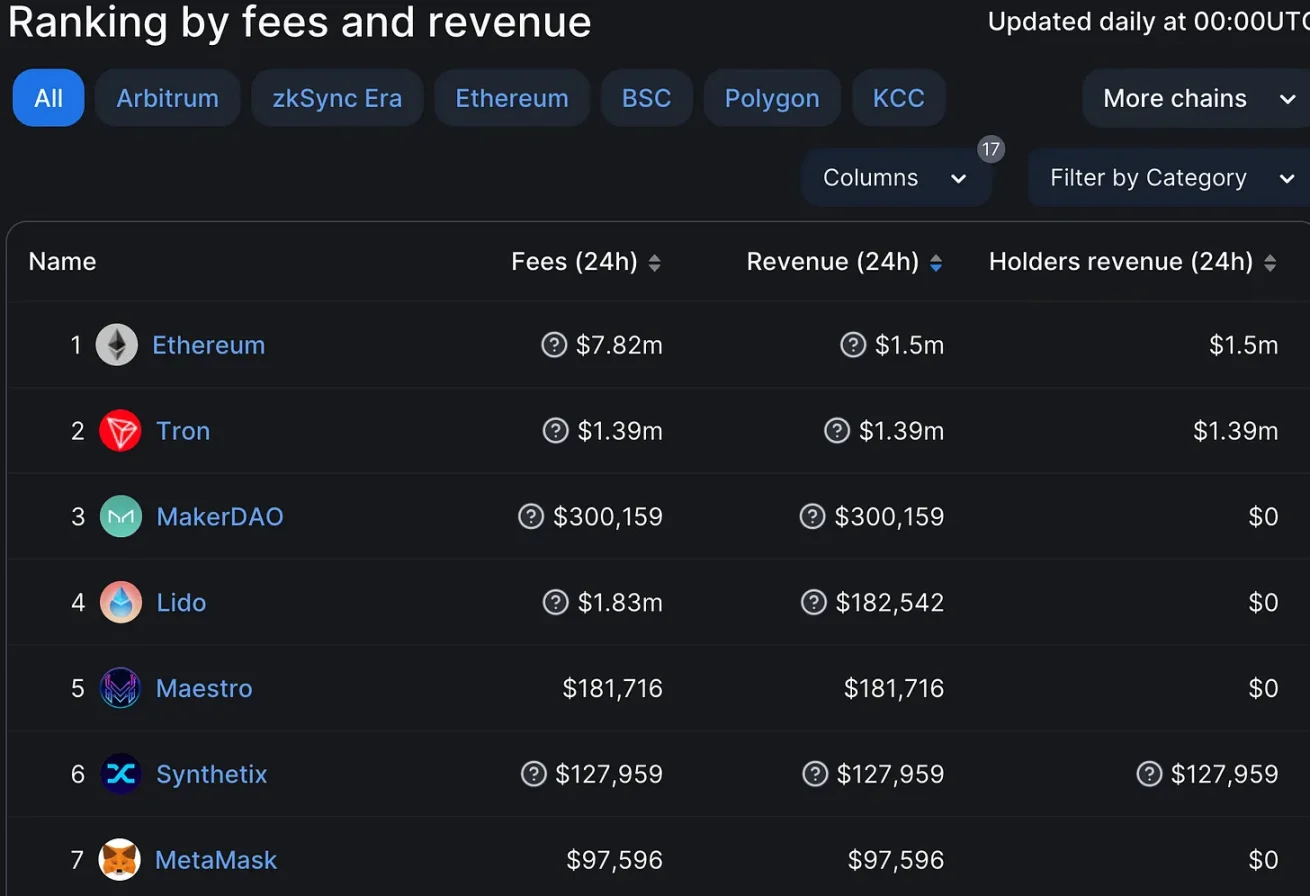 Maker 目前在创收方面排名第三:高于 Lido、Synthetix 和 Metamask。
