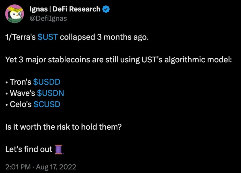例如,就在一年前,我写了篇关于 USDD、USDN 和 CUSD 算法稳定币的文章。几个月后,USDN 脱锚并重新命名为另一个 VOLATILE 代币。